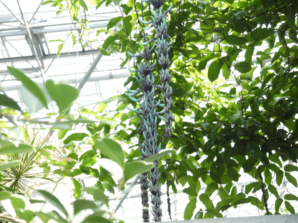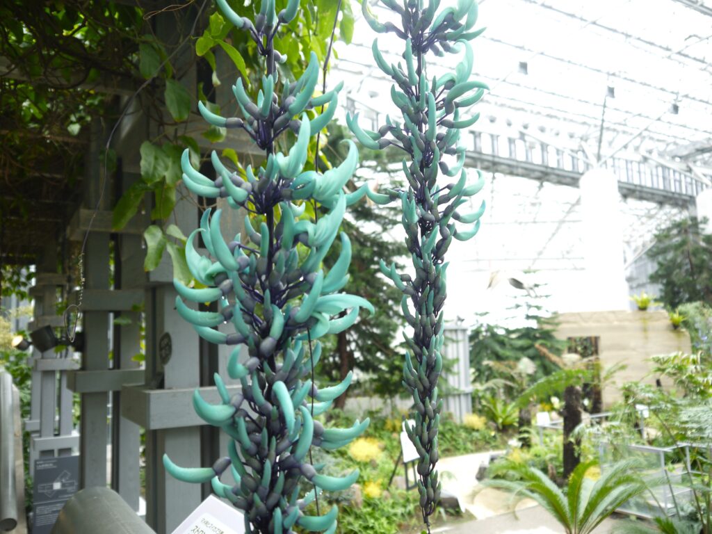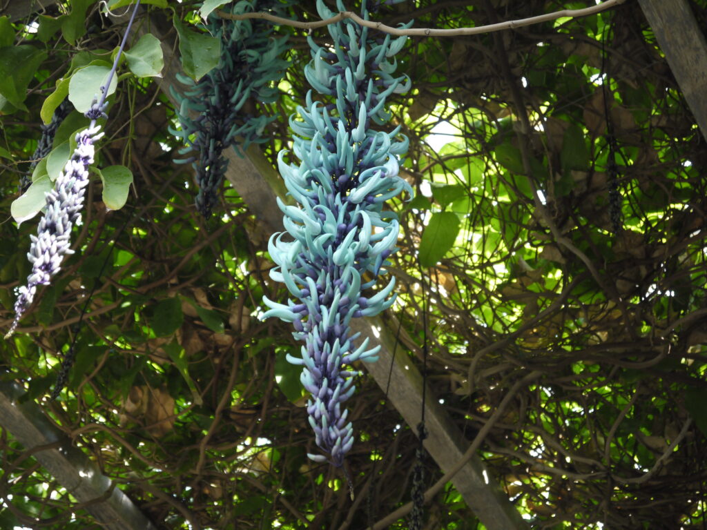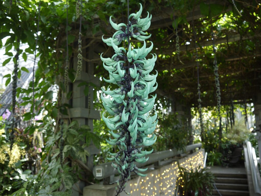 約8mのパーゴラに植栽されたヒスイカズラ。見ごろになると翡翠色の花が藤のように垂れ下がります。
