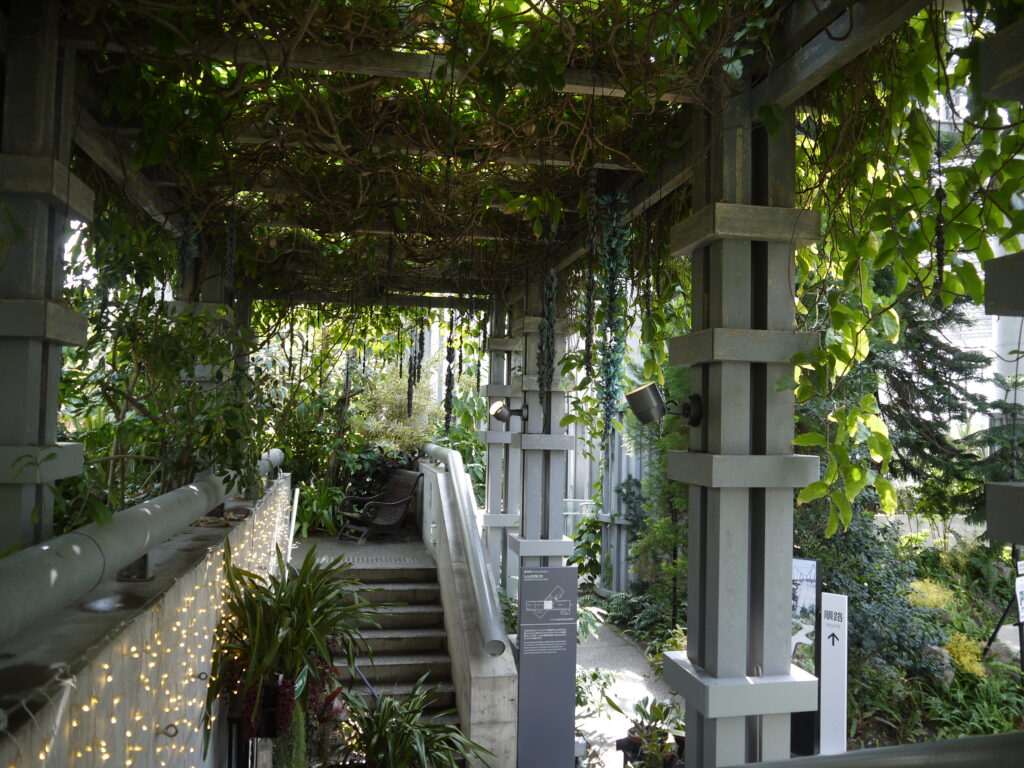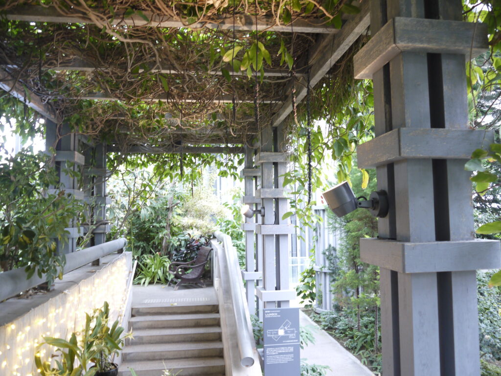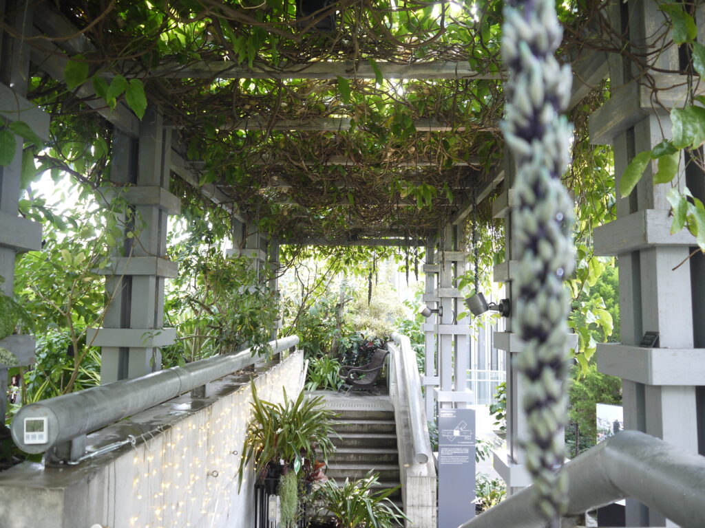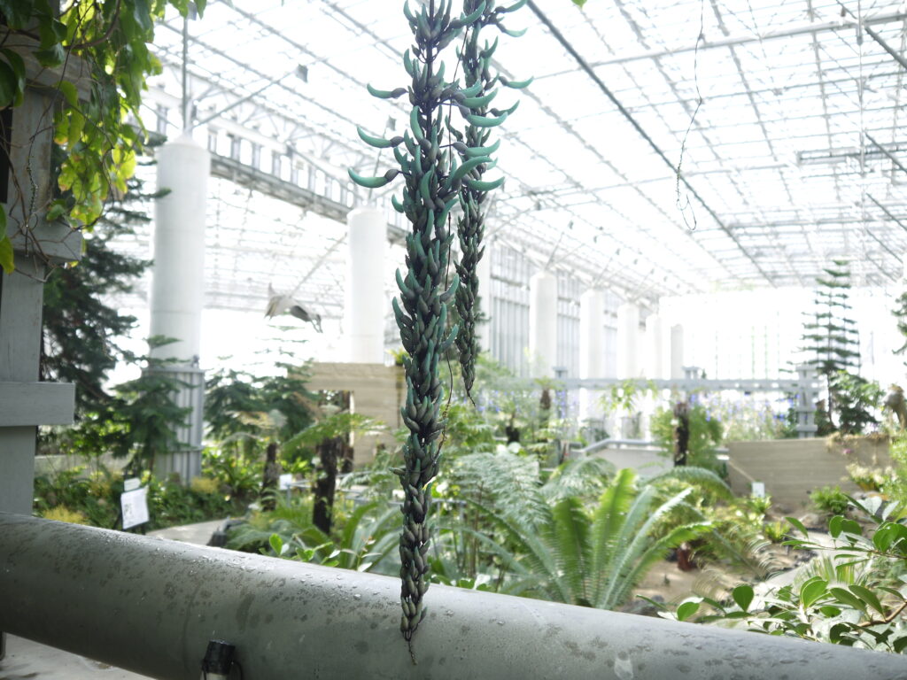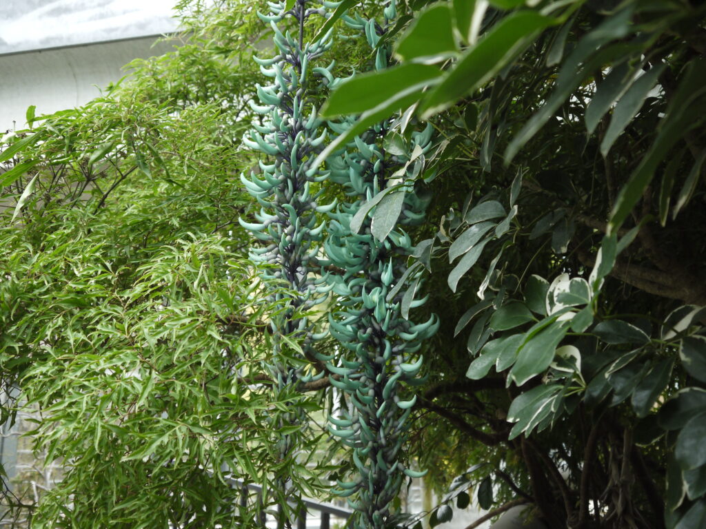 約8mのパーゴラに植栽されたヒスイカズラ。見ごろになると翡翠色の花が藤のように垂れ下がります。