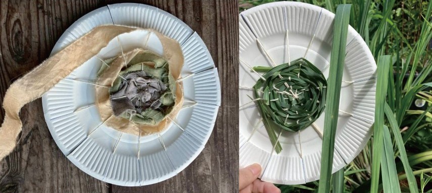 ②淡路島の草木染めの布や庭のレモングラスを使った紙皿丸織り(材料費各500円)