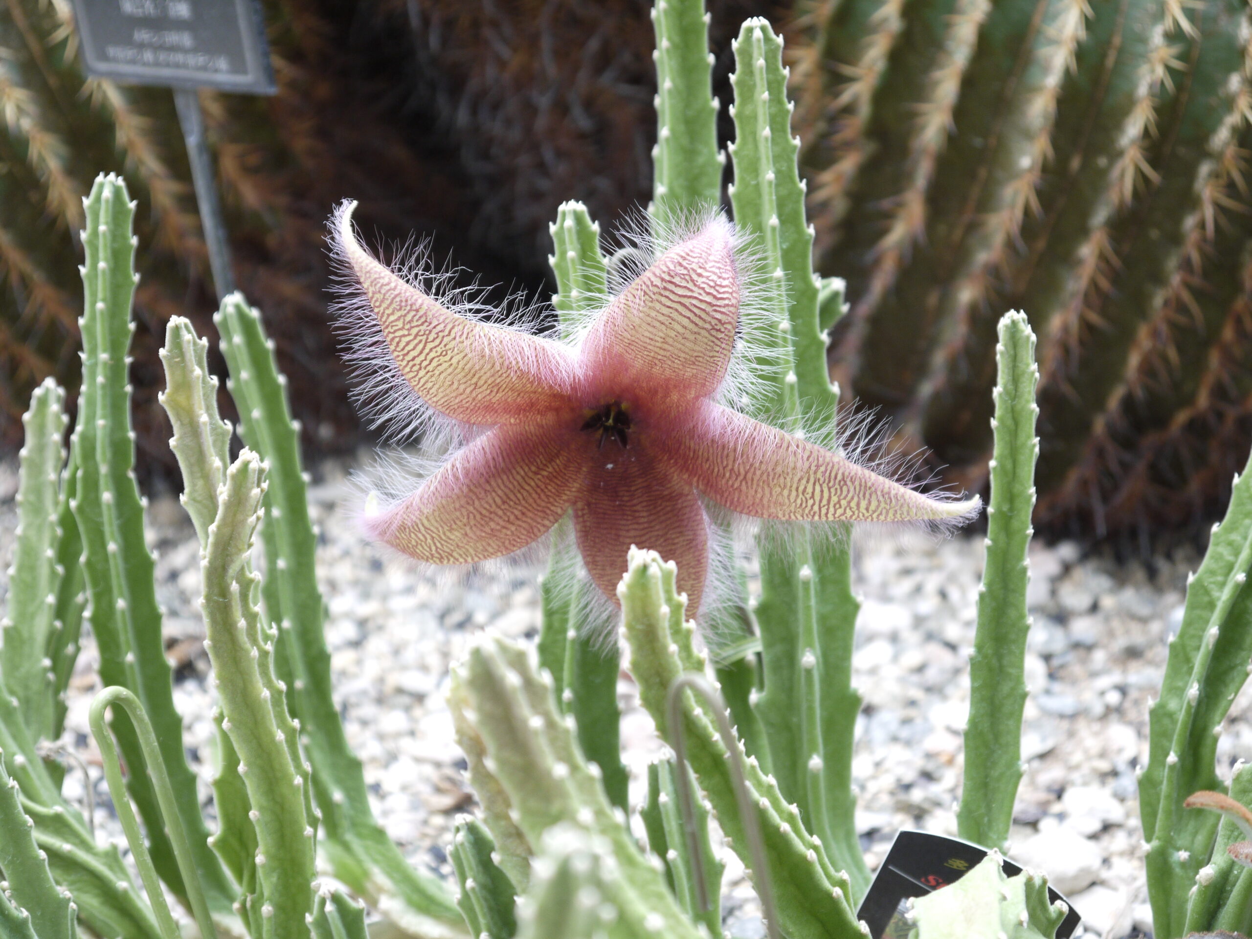 【展示室1】 ハエを呼び寄せて受粉する、ふさふさ毛深いヒトデのような星形の花が特徴の、スタペリア・ヒルスタが見ごろです。 南アフリカ原産の多肉植物。四角い肉厚の茎と、ヒトデのような大きな星形の花が特徴です。 花は夏の終わ...
