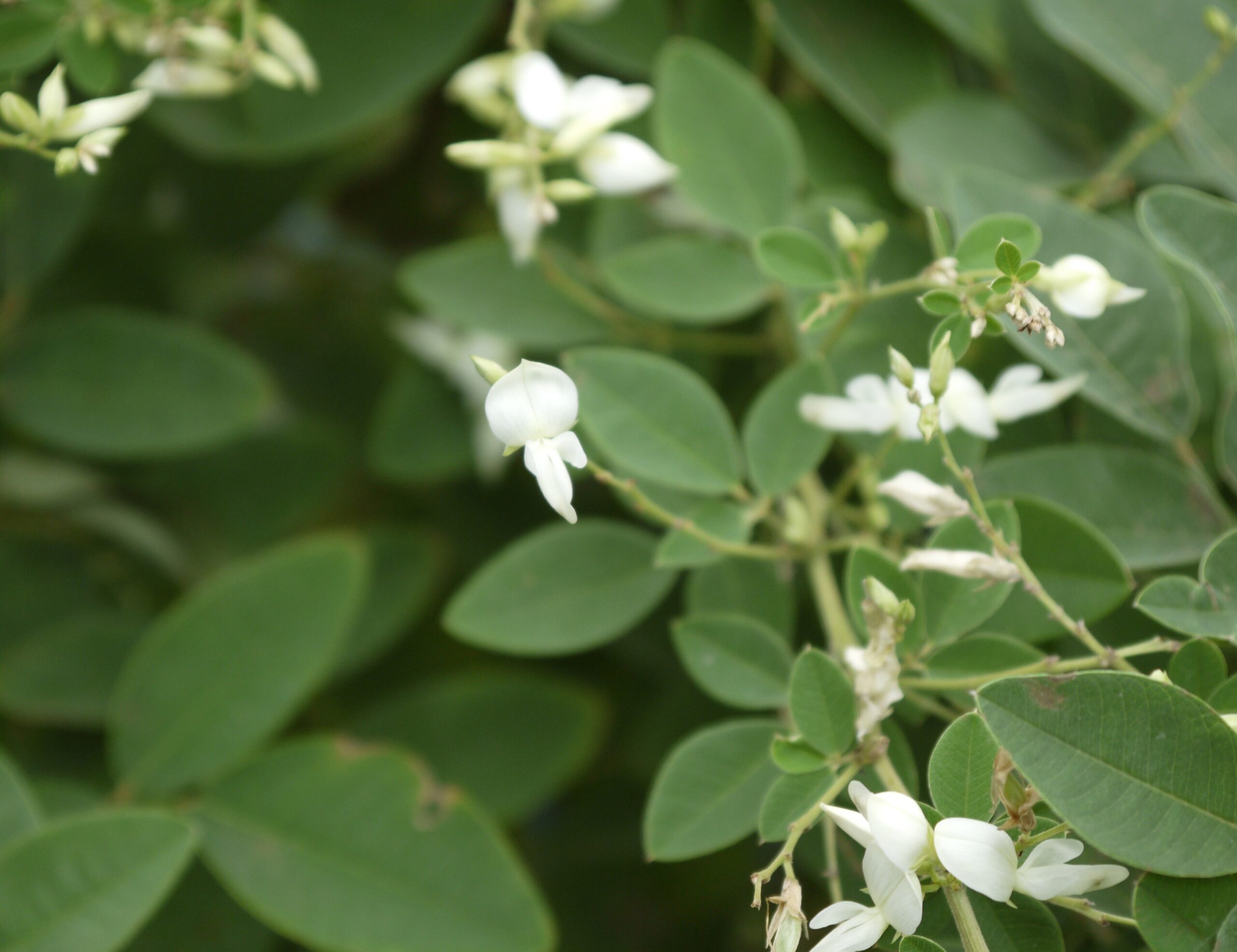 【展示室3】 白い花がふんわりと咲きこぼれる「シラハギ」。夏の終わりから秋にかけて、枝いっぱいに白い小さな花を咲かせ、枝はアーチ状に大きくしなり、まるで白い花のシャワーのように広がります。 葉は3枚が1組になった「三出(...