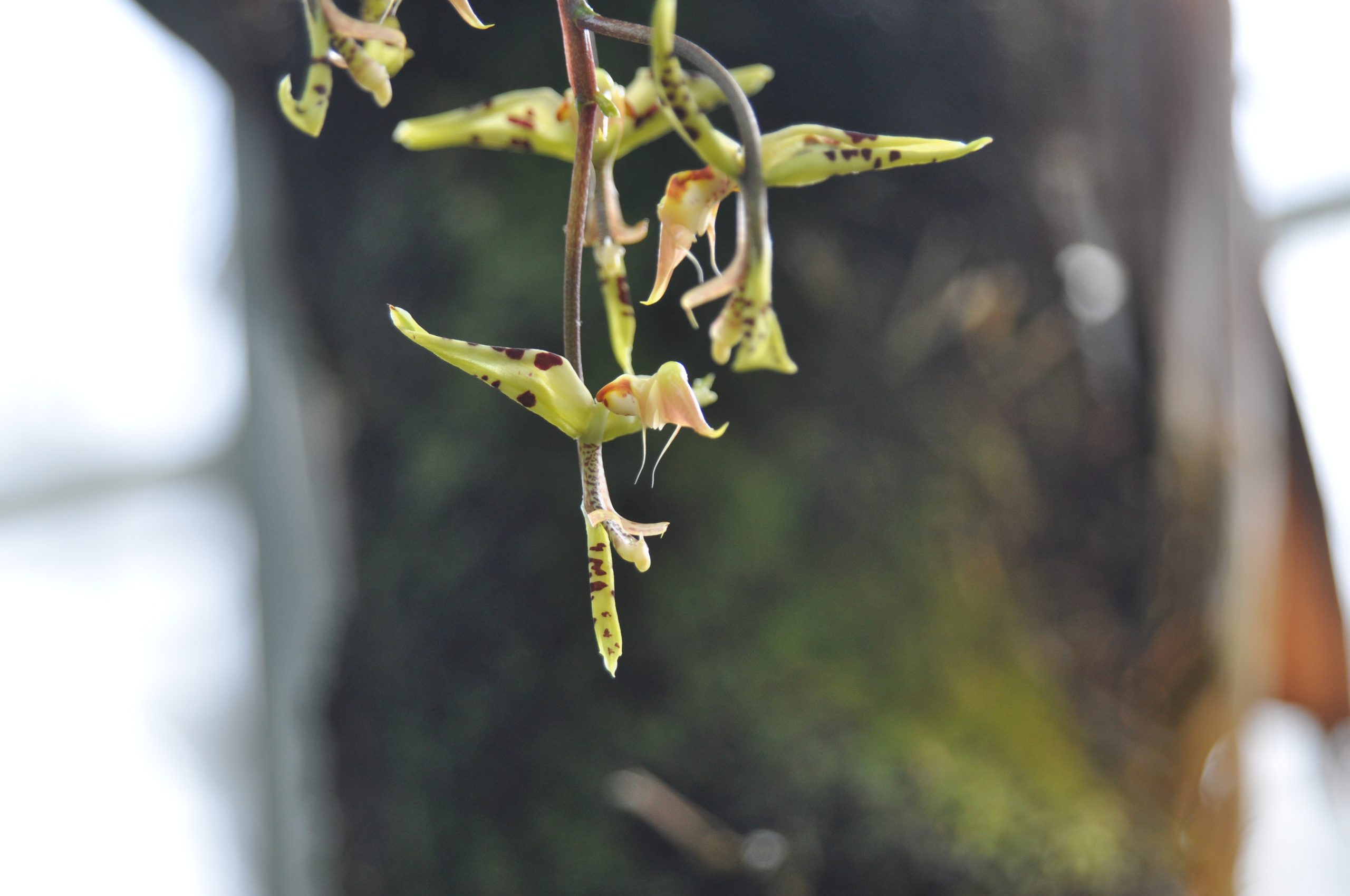 上下逆さまのラン「ゴンゴラ・キンケネルビス」が開花中です! 連なって咲く様子が鳥のようにも見え、花の構造がすべり台のようになっているユニークなランです。 鳥の羽のように左右に広がっているのは側萼片、上側にあるのが唇弁。下...