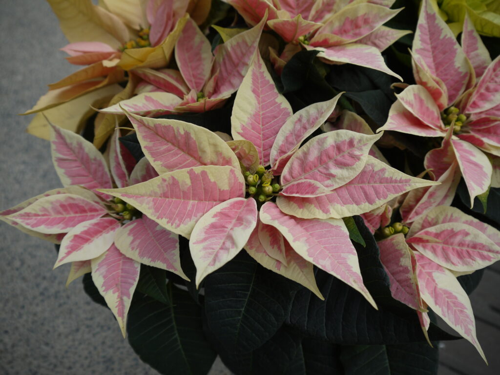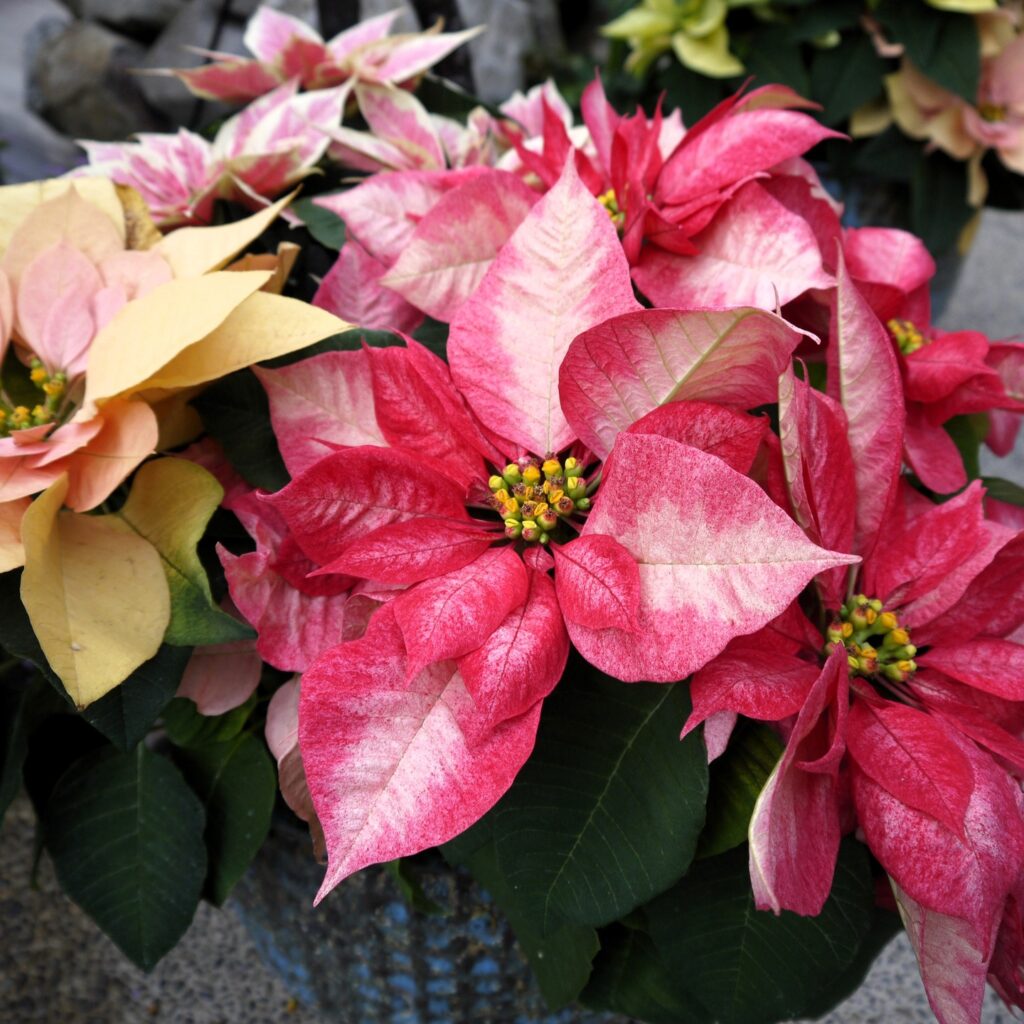 ポインセチアの「花」に見える鮮やかな赤やピンク、白などの部分は、実際には花弁ではなく「苞(ほう)」です。本当の花は、苞の中心にある黄緑色の小さな杯状の構造をしている部分です。