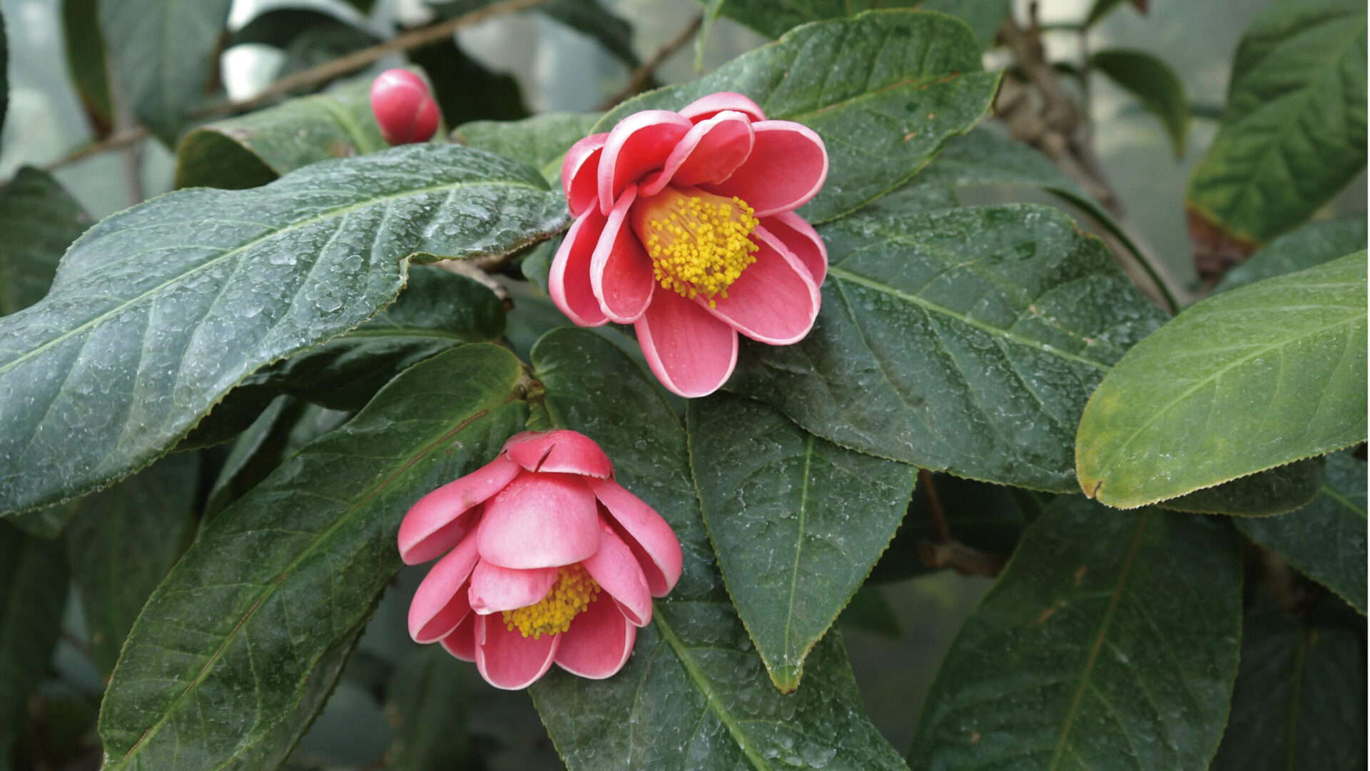 高さ2~3mになる半耐寒性常緑低木で、樹々の下などの暗い場所に生育するツバキの仲間です。ほとんどのツバキは頂生(ちょうせい)といって、枝の先に花を付けますが、この種は腋生(えきせい)、つまり葉のつけねの部分に花を付けるタイプです。