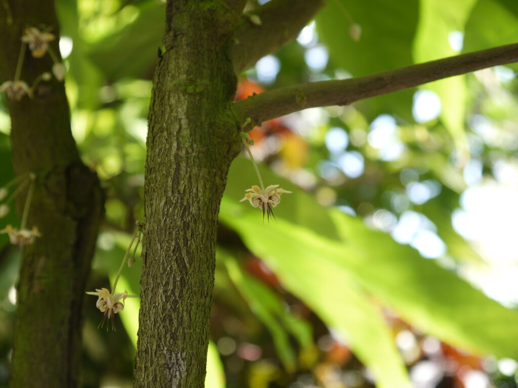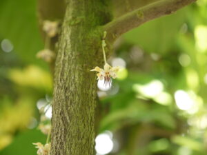 カオの木の花はとても小さく、直径わずか1〜2センチほどしかありません。色は白〜淡いピンクで、星のような形をしています。花のつき方は「幹生花(かんせいか)」で、枝の先ではなく、幹や太い枝の表面に直接咲くという特徴があります。(幹に直接花が咲く植物は、熱帯地方に多く見られる珍しいタイプです。)
